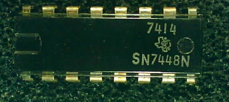 TI 社は PDIP の SN7449N という型番を販売しなかったようで、スタンダード TTL ではフラットパッケージ (SN7449W) のみカタログに存在します。不思議なことに「鍵あり版」の PDIP パッケージ SN74249N の方はカタログに存在します。