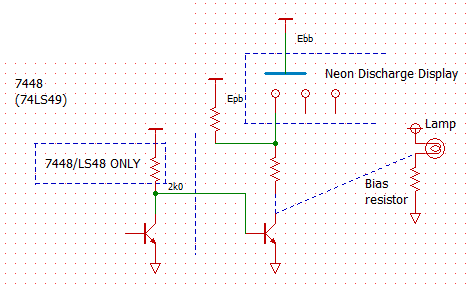 7448 は 7 セグメントデコーダ IC ですが、出力は オープンコレクタ(OC)に加えて 2kΩの抵抗でプルアップされており、なおかつ出力が負論理になっています。これは、NPN Tr を抵抗なしで外付けして表示器を駆動することを目的としています。外付け Tr を介することで、大電流を必要とする表示器や、放電表示管のように高電圧が必要な表示器のドライブが可能です。